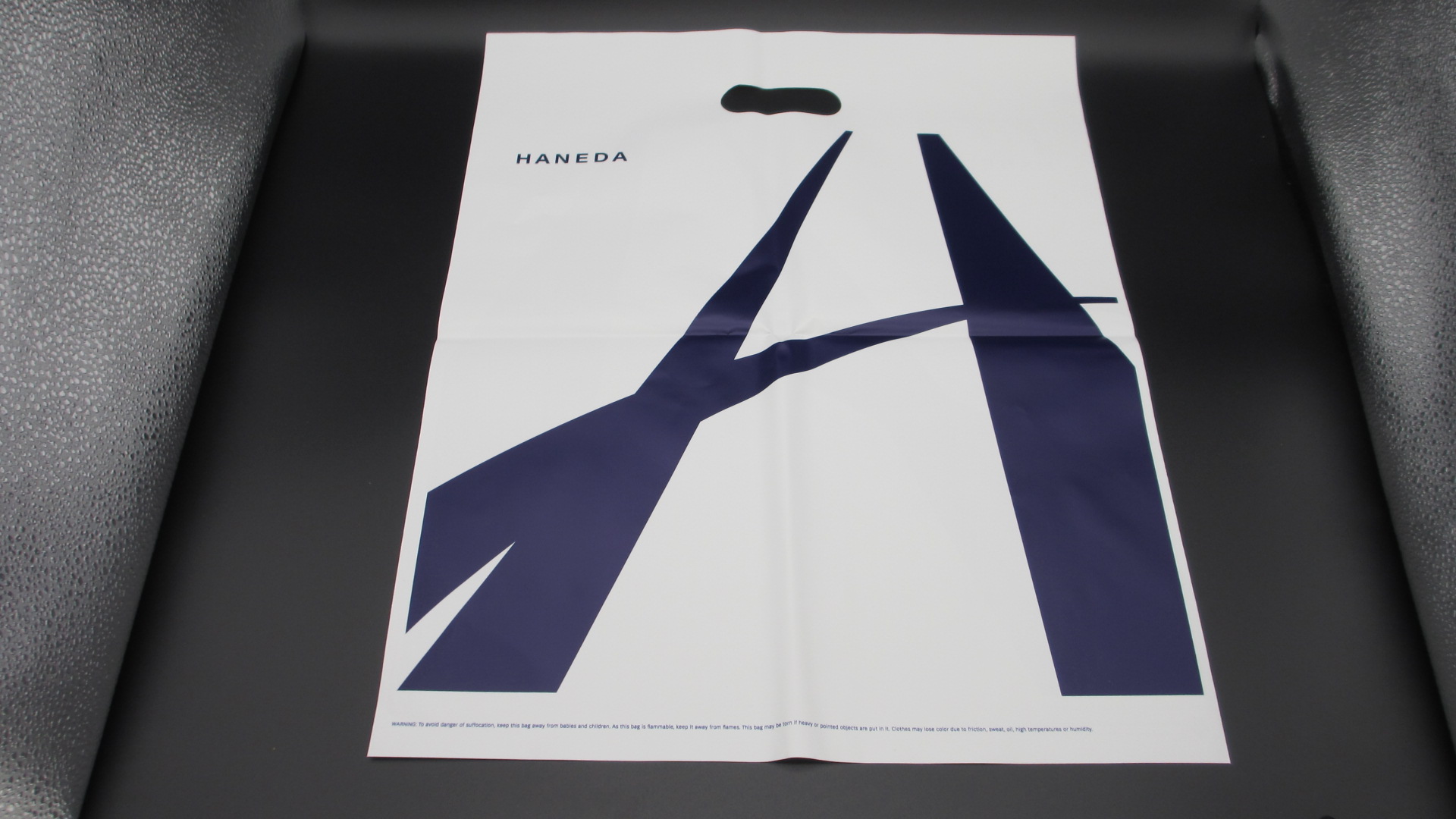 左:羽田空港公式通販サイトの手提げビニール袋×1、中央:チューリップローズ ギフト手提げ袋×1(写真は、裏表)、パンフレット