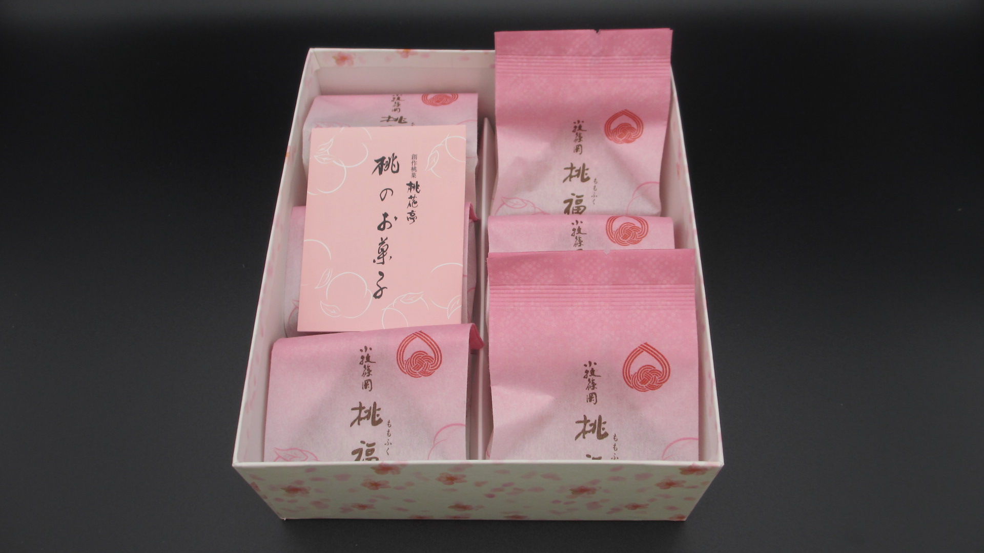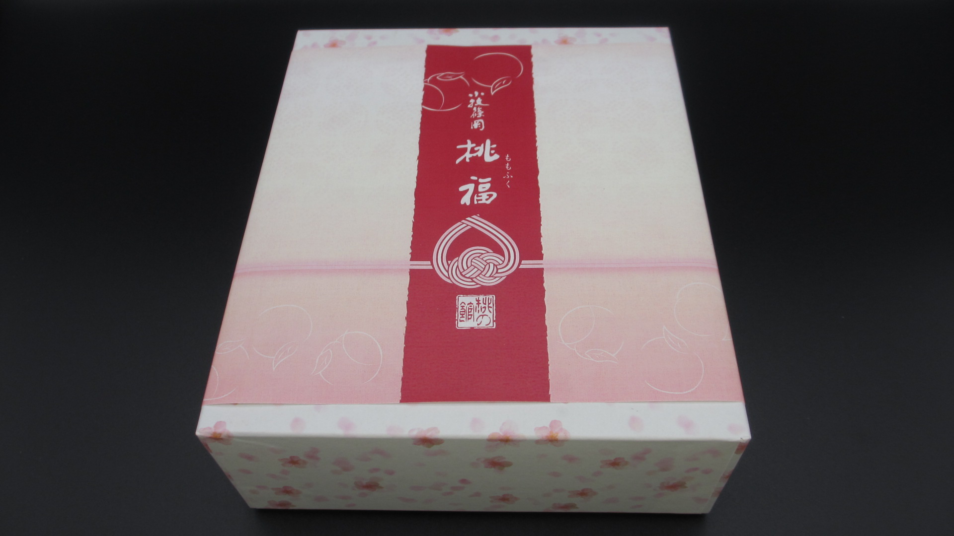 その中で、「小牧篠岡 桃福」の箱は、これ。かわいらしい桃の小花をあしらった花柄の箱に桃福のし