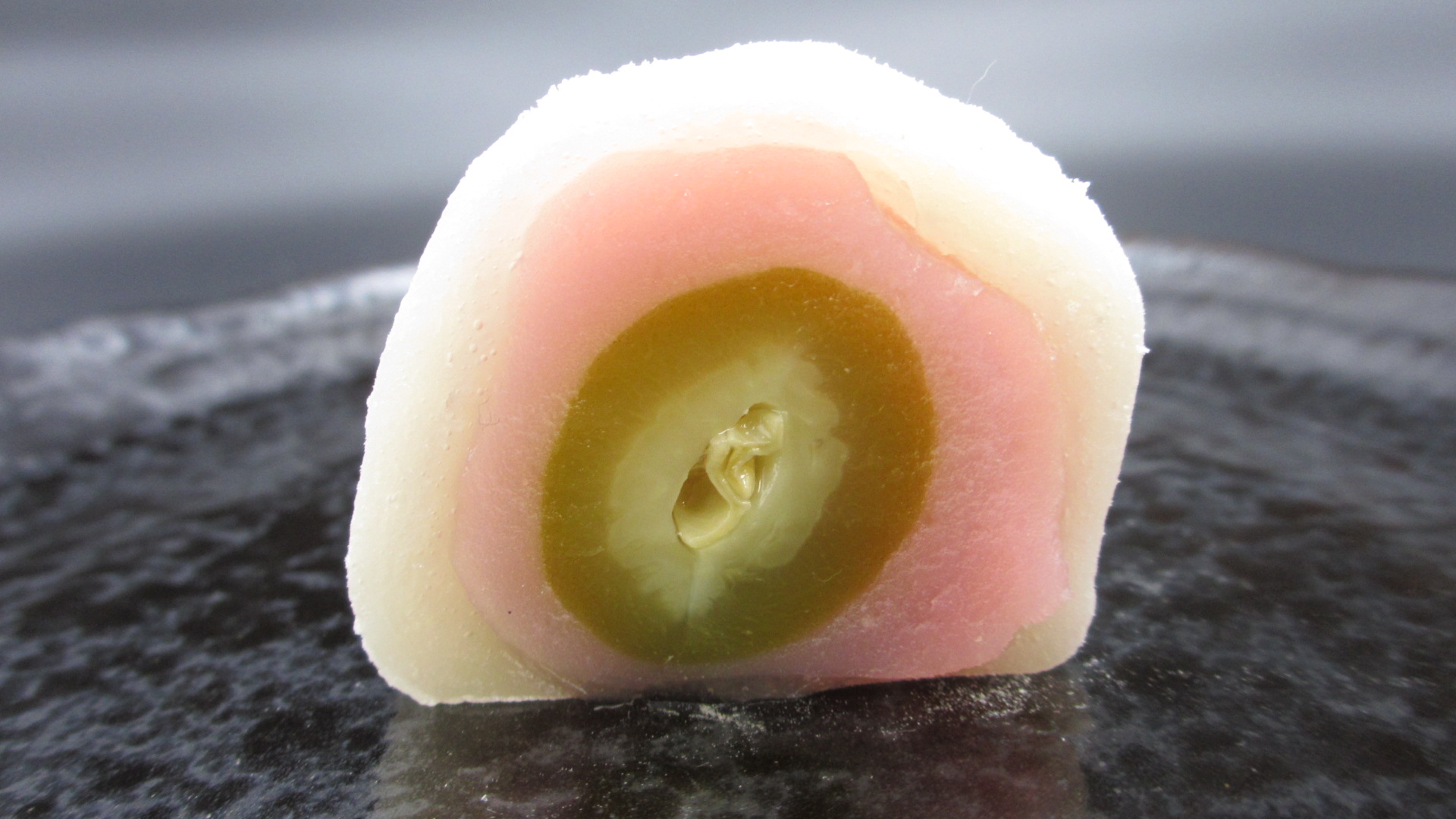 『ひな祭り』のお雛様の衣みたいな華やかな白、ピンク、緑、の層になっている断面の大福